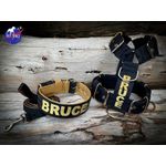 Coleira personalizada 5cm de largura, confeccionada com 2 camadas de polipropileno de 5cm e revestida com tecido de alta resistência sintético, costuras triplamente reforçadas e metais de aço INOX 6mm de espessura. Além de ter um design moderno é um produto extremamente resistente, ideal para cachorros de médio e grande porte que disponibilizam de muita força física.